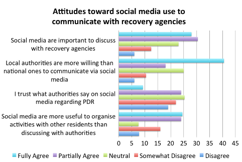Results show that the most-sought information concerned housing and infrastructure reconstruction, funds/refunds, business recovery, and damage assessment. City councils and regional councils are considered the main source of the information. Communication channels used to search for reconstruction-related information vary between online and offline respondents. Social media technology is used by citizens affected as a platform to read and share recovery information and post queries rather than as an engagement tool with recovery agencies. (Only 36% of the respondents used social media to communicate bidirectionally with authorities. The more the respondents were educated and the younger they were, the more likely they were to use social media with bidirectional purposes. Main barriers to engagement are lack of trust towards the authorities and the belief that authorities do not use social media to communicate with citizens. Lack of information technology (IT) skills was the most mentioned barrier in the paper survey (41%); this is probably due to the fact that mainly non-IT users answered the question. However, 25% still mentioned lack of time as a barrier, 16% did not trust authorities, and 13% did not believe that authorities communicate with residents via social media regarding reconstruction.
