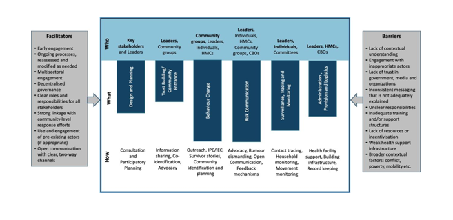 The review identified 6 broad types of community engagement actors: local leaders (traditional, religious, and/or governing); community and faith-based organisations (CFBO); community groups or networks or committees; health management committees (HMCs); individuals; and key stakeholders, which included students, survivors, women representatives, the elderly, and youth. These actors worked through 6 main channels: designing and planning interventions (including messaging), community entry and trust building, social and behavioural change communication (SBCC), risk communication, surveillance and contract tracing, and broader logistics and administration activities, such as procuring and setting up hand washing stations.
