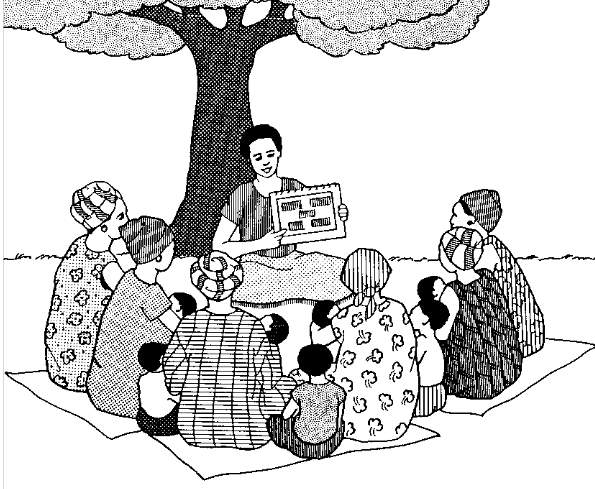 Figures included in the resource focus on: (i) a group discussion, and (ii) health workers giving a play.