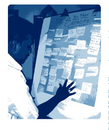 - Workshop sessions - Each session involves a discussion-based activity, followed by a group scoring exercise. Each area of capacity has an associated set of indicators that participants use to rate their own organisation's capacities.