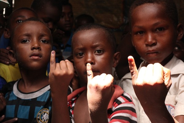 Image caption/credit: Children in Somalia show their ink-stained fingers that show they have received a dose of the OPV. WHO/T.Moran