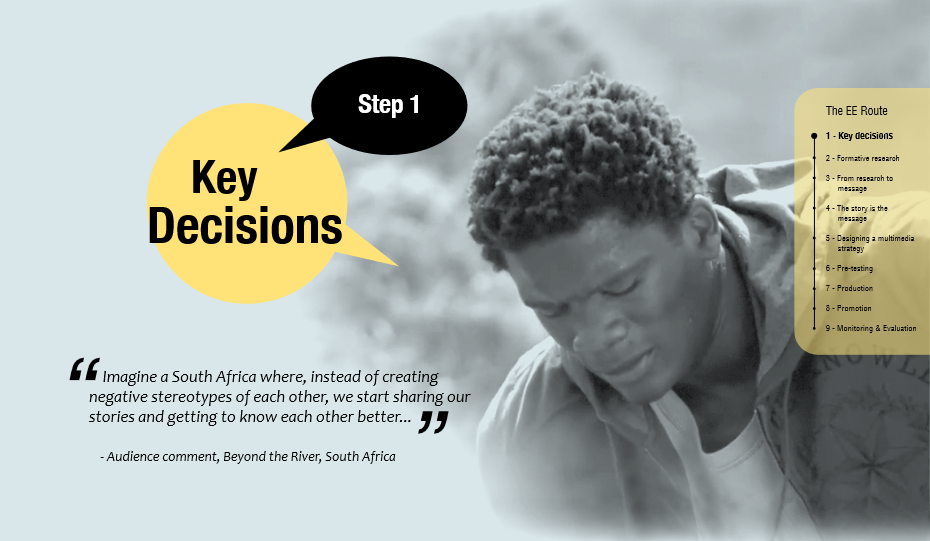 This chapter covers the key decisions that need to be made in the process of creating evidence-based entertainment education (EE) to address situations of complex social justice and reconciliation. It focuses on identifying the problem to be solved and the intended audience. It also looks at the alliances and partnerships required to implement and design an EE initiative.