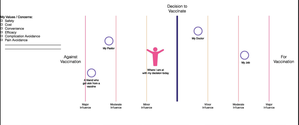 Also, in a prior publication, one of the authors outlined the use of an empathy tool (see image above) designed to help HCPs explore influences on an individual - e.g., their doctor, religious institution/pastor, friends, or favourite blogger - and how these influences impact their decision-making. This tool also helps the HCP explore an individual's values, concerns, and motivations within the decision-making process. Underlying the creation of the empathy tool is human-centred design, which aims to address a particular need through a systems-based approach. The empathy tool can also be applied to the exploration of the influences on HCP's beliefs and decision-making in regard to vaccines.