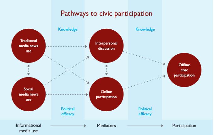 Based on their review, students developed a model of pathways to offline civic participation in which use of informational media (that is, news consumption) from traditional and/or social media platforms leads to offline civic participation, mediated by knowledge, political efficacy, interpersonal discussion, and online participation. Civic participation available on social media can include: signing a petition; learning about an issue of interest; blogging; and tweeting on Twitter, among others. The media stimulus for participation might be: traditional media (TV, radio, and newspapers), especially in rural areas, or social media, including text messaging on mobile devices (SMS), Twitter, blogs, and Facebook.