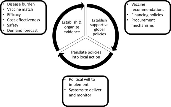 The schematic presented in the paper organises the major steps in the process of establishing and organising evidence, developing supportive global policies, and translating policies into local action. International and national coordination efforts, proactive planning from conception to implementation, and country-specific, cultural, and local factors that must be considered during the implementation of the immunisation in pregnancy programmes are outlined.