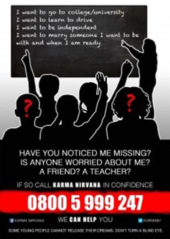 Karma Nirvana firstly started a national Helpline called the National Honour Network Helpline which is dedicated to supporting victims who have experienced forced marriage and honour-based abuse. Their call handlers deal with over 800 calls per month to provide confidential listening support, options and guidance to victims and survivors of honour based abuse. The helpline is also intended for professionals, such as teachers and police officers, who need assistance in dealing with these issues.