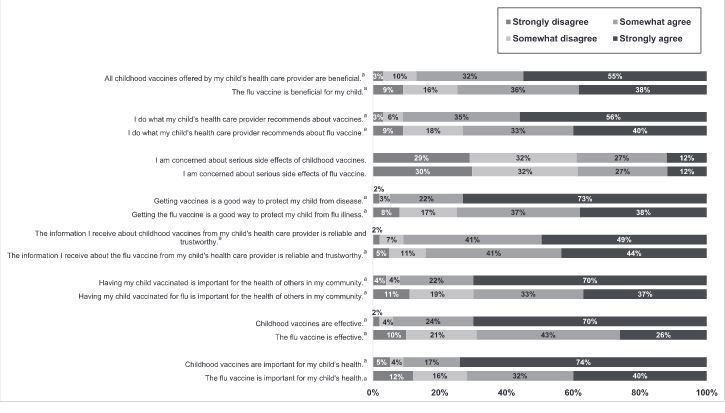 The item most associated with hesitancy about childhood vaccines was having concerns about serious side effects, with 12% strongly and 27% somewhat having this concern.The percentages of parents who were strongly or somewhat concerned about serious side effects of influenza vaccine were identical to those seen for routine childhood vaccines. However, only 26% strongly agreed that the influenza vaccine is effective, compared with 70% for childhood vaccines (P < .0001). Parents were also less likely to perceive influenza vaccines as important for their child's health, to agree that influenza vaccines are beneficial and a good way to protect their child from disease, and to report doing what their child's health care provider recommended regarding influenza vaccines.