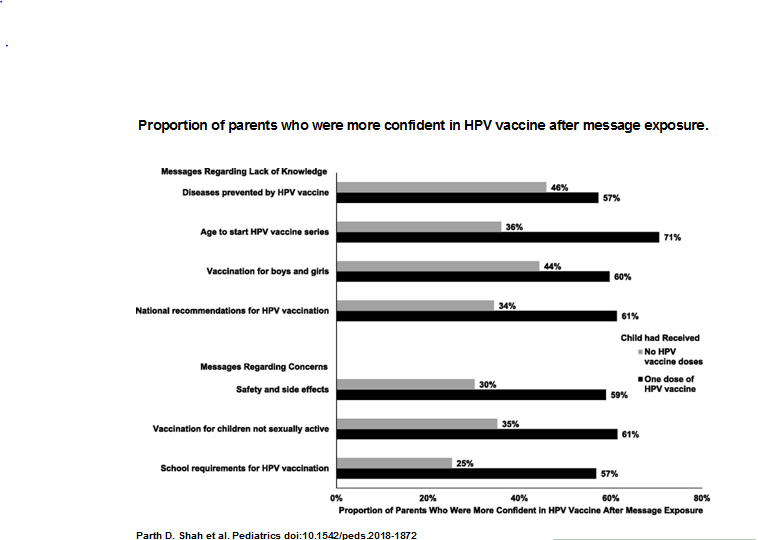 Thus, this study offers research-tested messages that providers can use to address parents' HPV vaccination questions and concerns about 7 common topics. General communication principles for increasing message effectiveness are to include information on the benefits of vaccination (including cancer prevention) and avoid expressing urgency to vaccinate when addressing parents' questions or concerns. Brief messages that address common questions and concerns can boost the confidence of parents with children who have initiated HPV vaccination. However, providers may need to be prepared to have longer conversations with parents who express concerns about HPV vaccine, especially regarding safety and side effects. Patients in other studies have reported finding value in receiving additional information, such as from fact sheets, and in participating in motivational interviewing. As a means of conveying complex information about HPV vaccination, providers may consider using validated visual aids in their conversations with parents,36 particularly those who may have lower levels of health literacy.