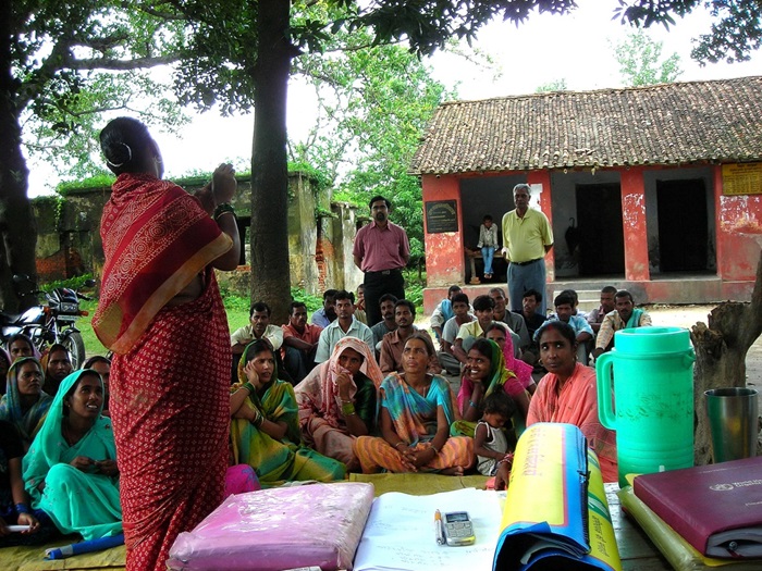 - Working to protect the community: "Involvement of female vaccinators from the local communities has been a hugely successful intervention in the eradication program, and has led to markedly better quality of vaccination campaigns. Their courage in facing the adversities, both natural (flood, inclement weather, inaccessibility) and man-made (insecurity, political instabilities); and their dedication in walking bare footed for miles with a vaccine carrier on their back to reach the hardest to reach areas, have contributed to ending polio in India and on the verge of being eradicated from all corners of the earth." The image above illustrates women's role in sharing knowledge; it is of a vaccinator training other vaccinators and medical officers at an open-air training session, Madhubani, Bihar, India.